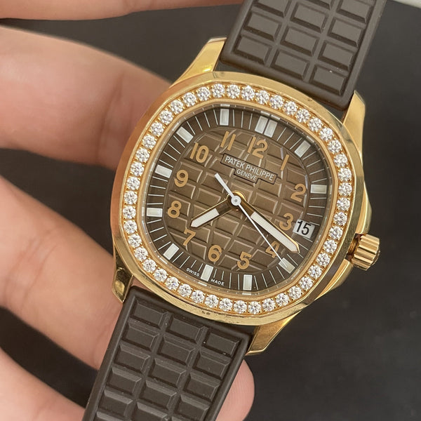 This Patek Philippe Aquanaut 5068R is in exceptional condition, showcasing its pristine rose gold case, sparkling diamond bezel, and flawless dial. The rubber strap and clasp are in excellent condition. Fully serviced and ready to elevate any collection.